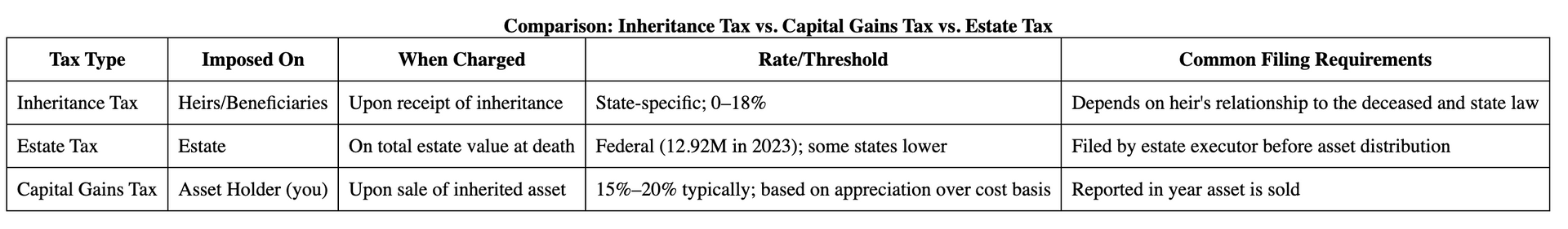 It’s vital to differentiate between these taxes: inheritance tax is levied on heirs based on their share, estate tax is deducted from the estate before distribution, and capital gains tax is due only upon the sale of inherited assets that have appreciated in value. Not every state enforces inheritance taxes, but those that do can reduce your final inheritance by several percentage points.